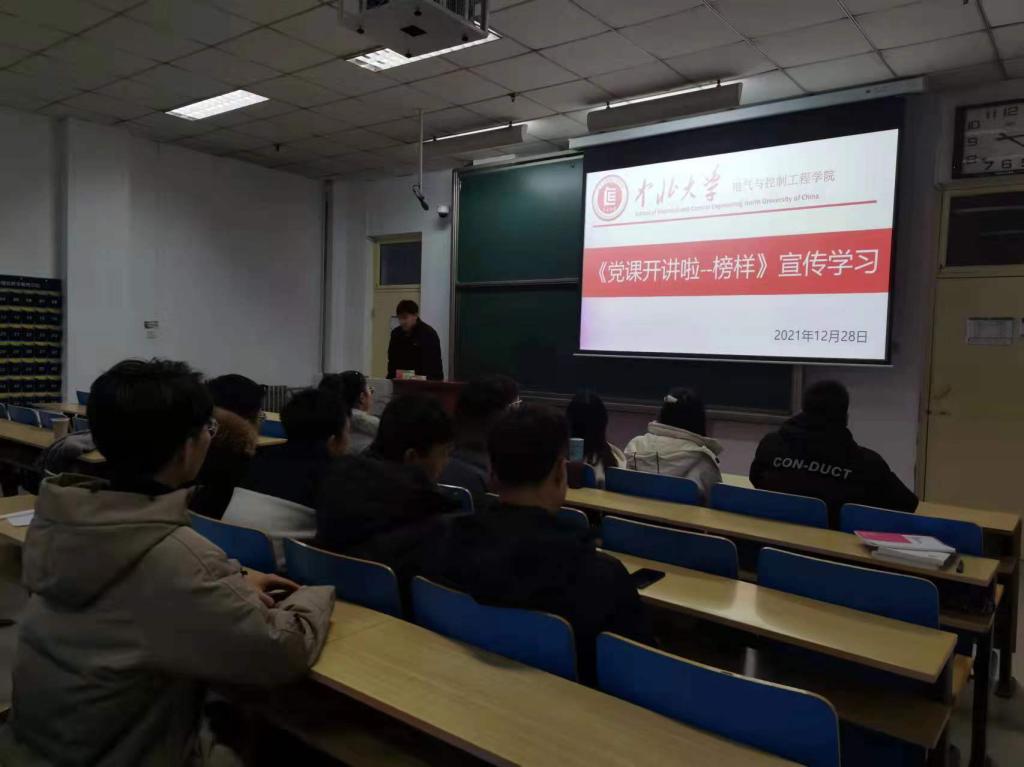 2021年12月28日下午在11111H教室,巨乳无码 组织全体研究生会成员观看《党课开讲啦——榜样》第二期:《迎春花开》。