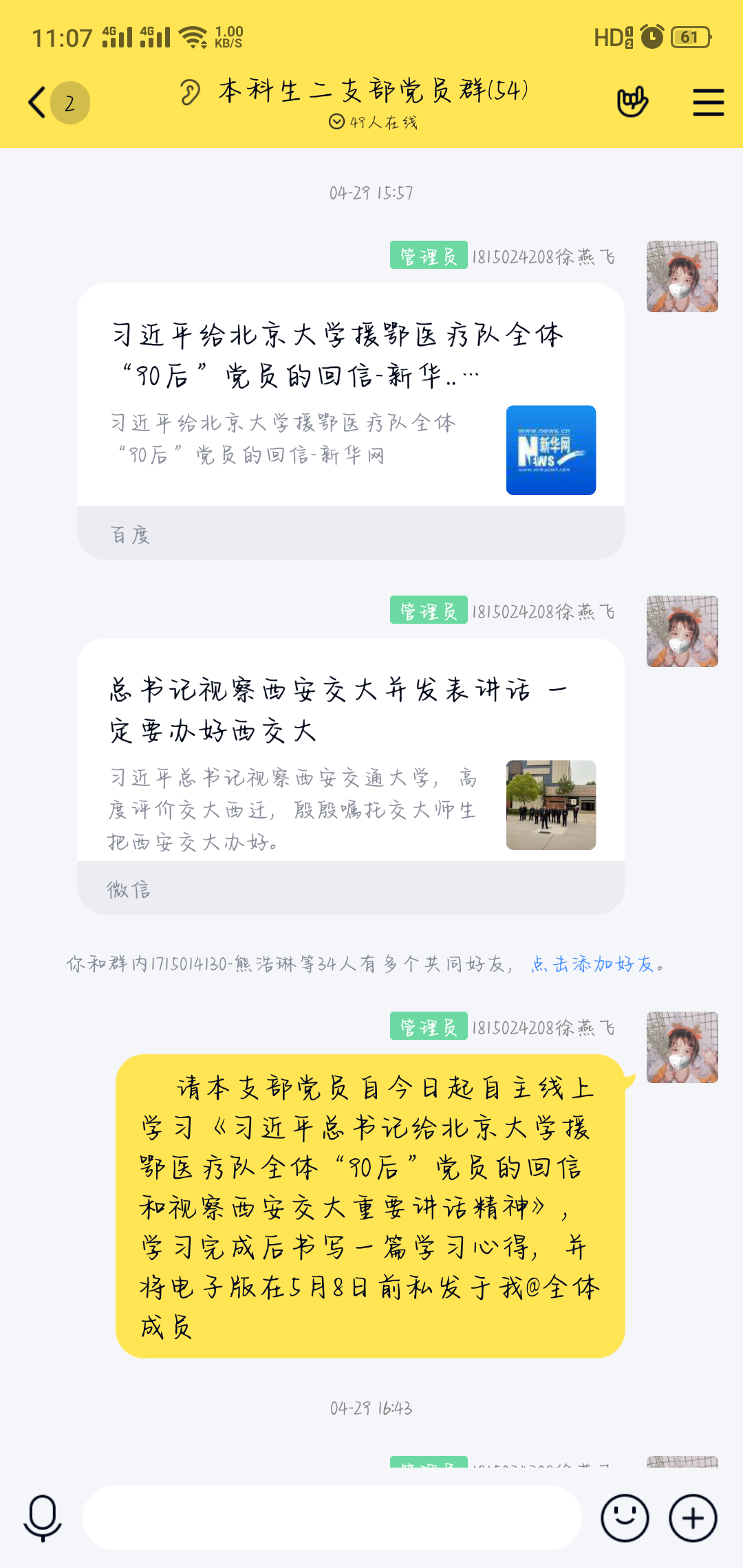 为深入学习习近平总书记的回信精神以及讲话精神,进一步做好疫情防控决胜期和复学前的思想引领工作,4月29日,本科生二支部组织党员们线上自主学习了“习近平总书记给北京大学援鄂医疗队全体‘90后’党员的回信和视察西安交大重要讲话精神”。