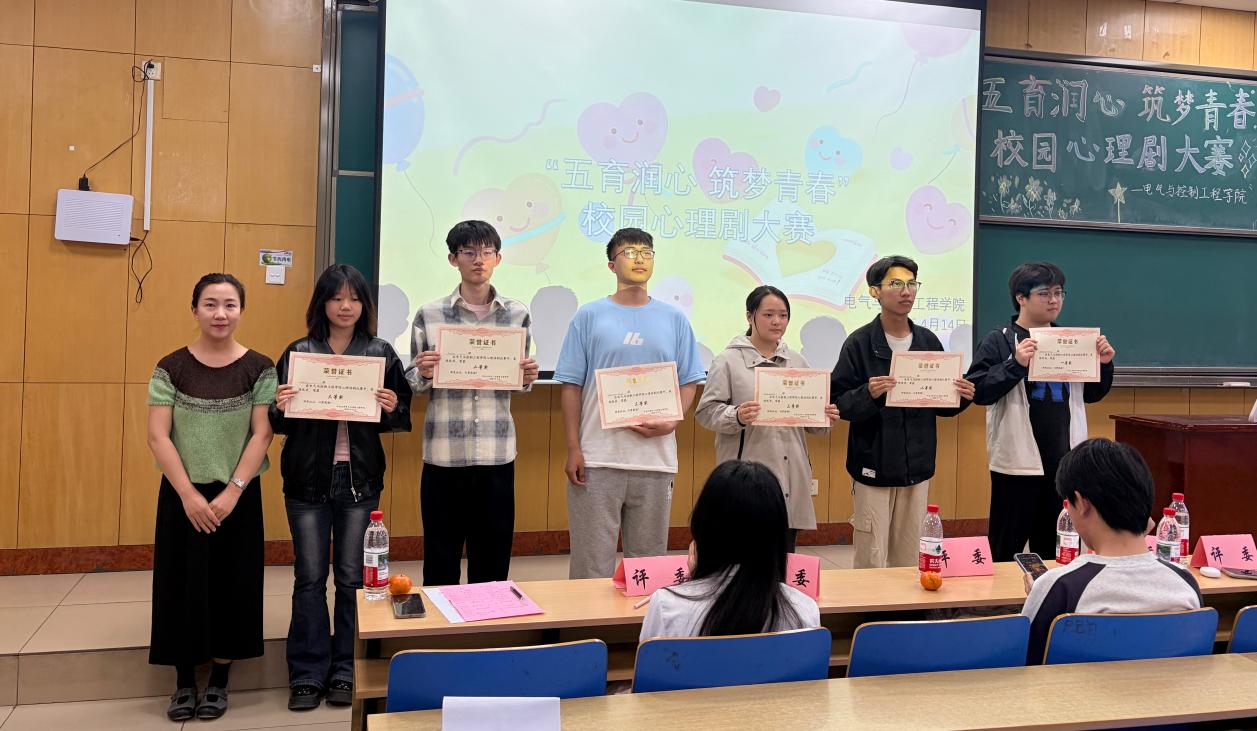 比赛现场,各参赛队伍聚焦当代大学生在时间管理、自我认知、人际交往等方面面临的现实议题,将日常学习与生活中的所思所感融入剧本,通过生动的表演诠释了新时代大学生关注心理健康、积极向上的精神风貌。其中,24150141和24150142班的作品《时间都去哪了》直面“手机依赖”这一普遍难题,凭借深刻的立意和精湛的表演斩获一等奖,引发观众对自身时间管理的反思。此外,多个班级的剧目也各具特色,从不同维度探讨了心理健康话题。最后,共有12支队伍完成剧目演出,李老师为获奖队伍颁发荣誉证书。