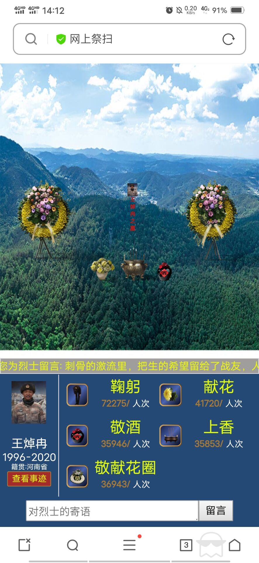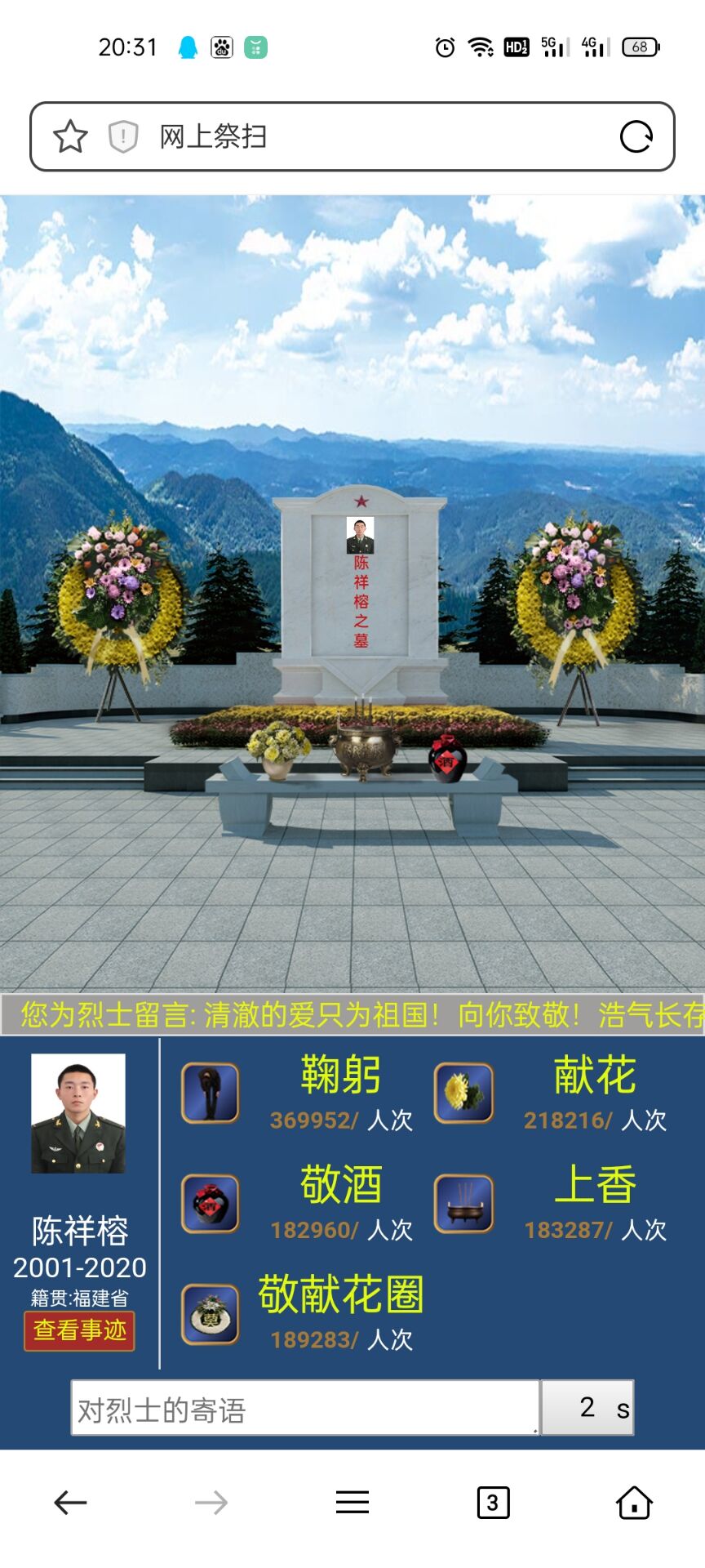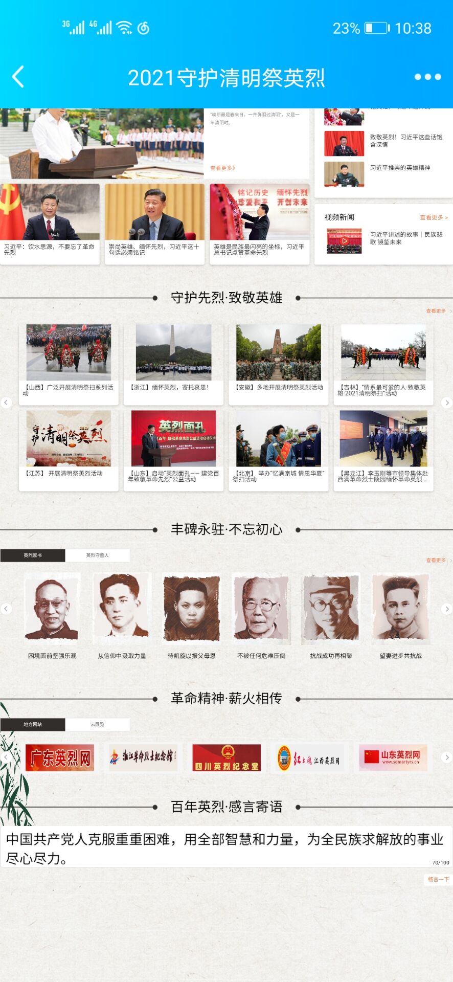 还在清明之际组织了线上祭英烈的活动,通过中华英烈网,组织全院同学缅怀先烈。在这次活动中,同学们可以自由点击自己想要了解的相关内容,并向烈士们献花,鞠躬,在留言栏留言,表达自己的缅怀之情。同志们寄语质朴,感情真挚,充分展示了当代大学生对革命先烈的满腔热爱,立志学习先烈的高尚情操。在活动中,同学们进一步了解了烈士们为人民抛头颅,洒热血,不惜牺牲自己的生命的感人事迹,更深刻的体会到了先烈们那种坚贞不屈,英勇无畏的高贵品质和革命精神。